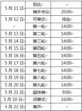 9.2 组委会将为免费棋手提供5月10日下午至5月22日中午的免费食宿。免费棋手入住双人间或三人间。