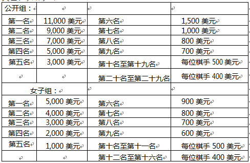 超快棋奖金为6000美元,公开组4000美元,女子组2000美元。