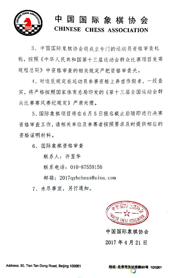 3、中国国际象棋协会将成立专门的运动员资格审查机构,按照《中华人民共和国第十三届运动会群众比赛项目竞赛规程总则》中资格审查的相关规定严把资格审查关。