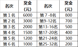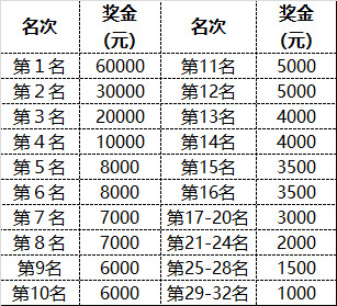 2.国际公开组前32名(21.7万元),奖金分配如下: