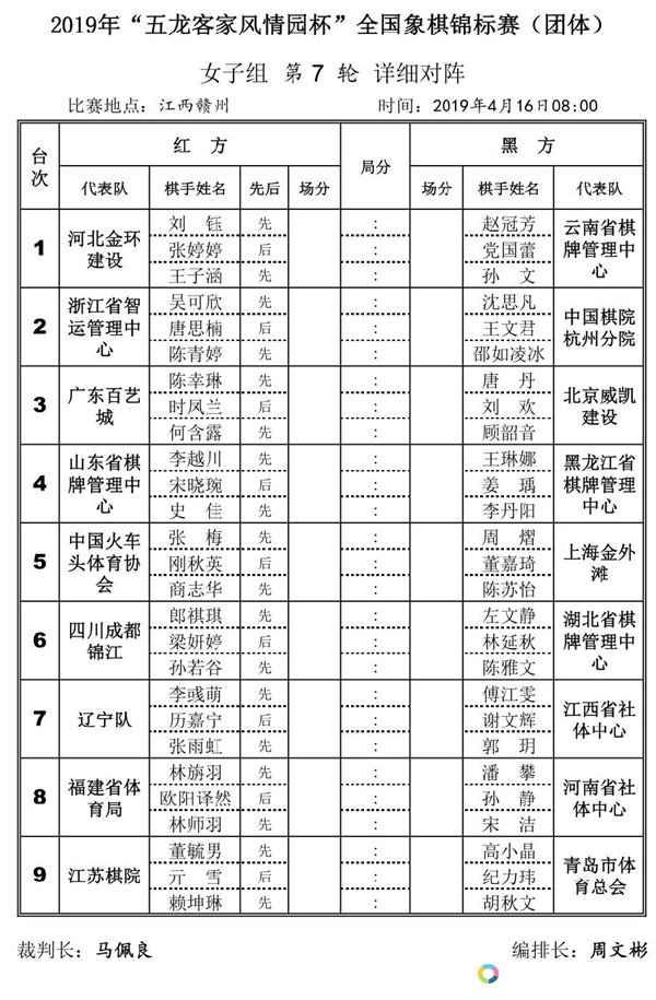 2019年全国象棋锦标赛(团体)女子组第7轮对阵
