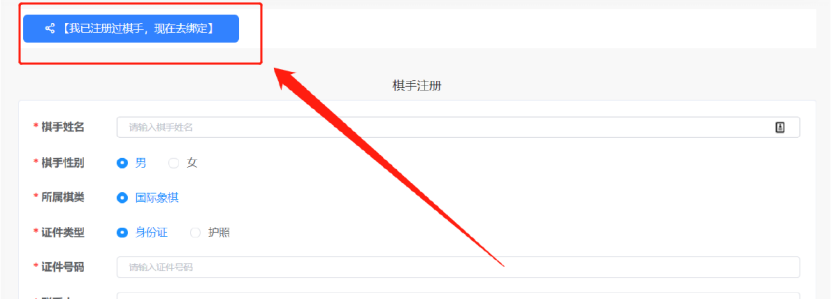 3. 若显示“该证件号已被注册”,请点击注册页面最上方按钮,进行棋手绑定。