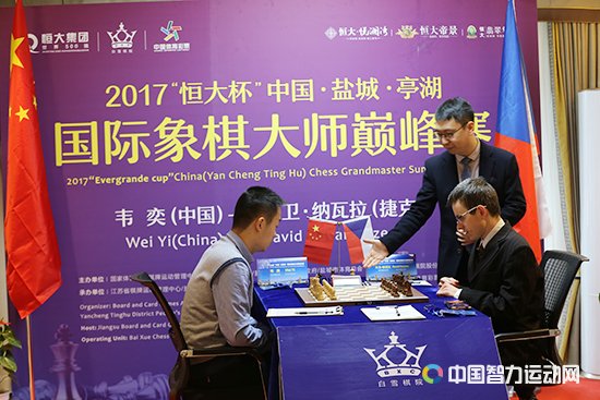 中国智力运动网讯 元月2日,“恒大杯”中国(盐城)国际象棋大师巅峰赛在江苏盐城亭湖区恒大悦澜湾售楼处展开了第3轮角逐。韦奕在比分落后的情况下镇定自若,抓住机会战胜纳瓦拉,将大比分扳平。