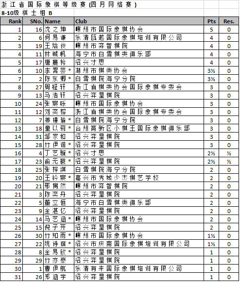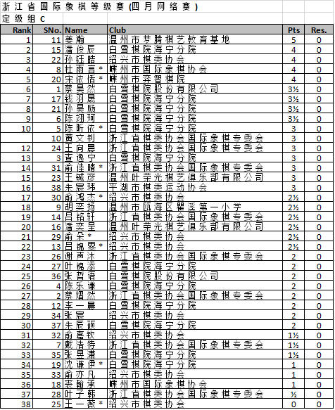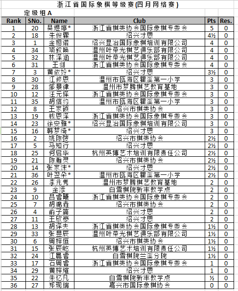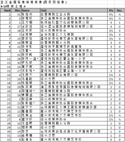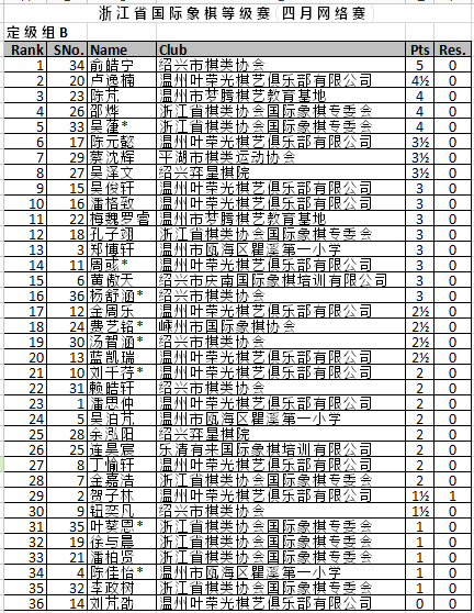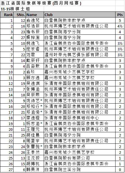 浙江省国际象棋等级赛(四月网络赛) 最终排名