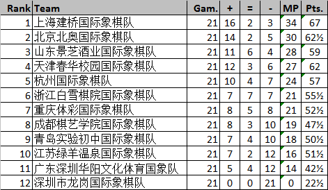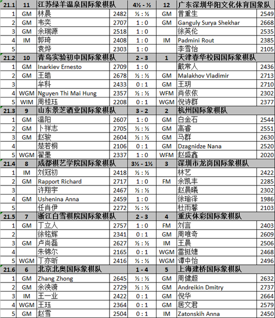 同样备受关注的保级战方面,江苏绿羊温泉队本轮对阵积分相同的广东深圳华阳文化体育队,两支队伍此前暂列积分榜倒数二三位。最终本轮韦奕、余瑞源、郭琦、袁烨分别战胜各自对手甘古力、徐英伦、帕德米尼、李雪怡,另外一场林晨弈和曾重生,江苏队以4.5比0.5大比分战胜广东队,顺利获得保级资格的同时,也将对手广东队送入了降级区,至此降级队伍也全部揭晓,广东、深圳两支兄弟队降级。