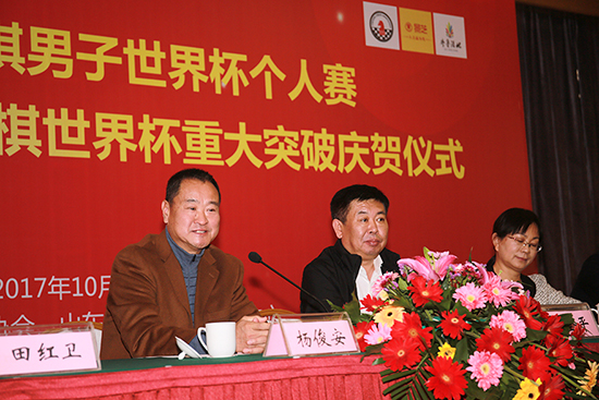 中国国际象棋协会主席、世界国际象棋联合会副主席杨俊安,棋牌运动管理中心国际象棋部主任、中国国际象棋协会秘书长田红卫,山东景芝酒业股份有限公司党委书记、董事长刘全平,中国体育报副总编辑陈君,齐鲁晚报棋院院长刘玮以及中国国际象棋男队教练徐俊和丁立人、卜祥志两位棋手出席了庆贺仪式。