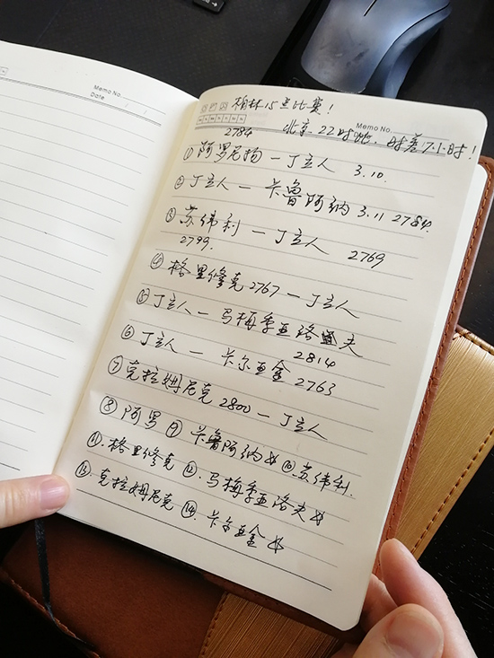 徐俊老师身经百战,经验老道并且心细如发。虽然现在已经电子时代,他仍然保持着做笔记的习惯,厚厚的三本日记,除了丁立人对手的最新对局外,还有一些比赛细节的信息。