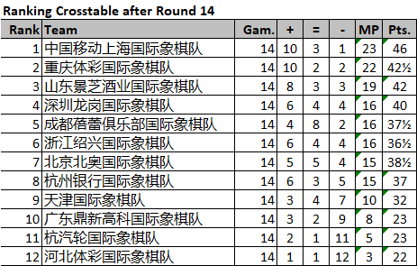 上海积23分继续领跑,重庆队22分紧随其后,山东19分位居第三,深圳、成都、浙江同积16分位列4至6位,北京、杭州同积15分暂列7、8位,天津10分、广东8分,杭汽轮5分、河北3分分列9至12位。