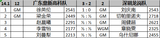广东已经连折两阵,本场比赛老将梁金荣披挂出阵,表现出舍我其谁的气势。从等级分上看,广东平均只有2334,比对手低出200分左右。然而,小将徐英伦继续着出色的状态,战胜了刘庆南。也是凭借这盘胜利,广东3比2战胜了深圳。