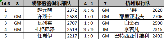 在这场比赛中,成都队人品爆棚,许翔宇和任肖伊分别拿下杭州队两名外援埃里亚诺夫和巴特西亚什维利,而自己的外援瓦列霍则战胜了白金石。正常说来,4比1的比分不是双方真实水平的写照。