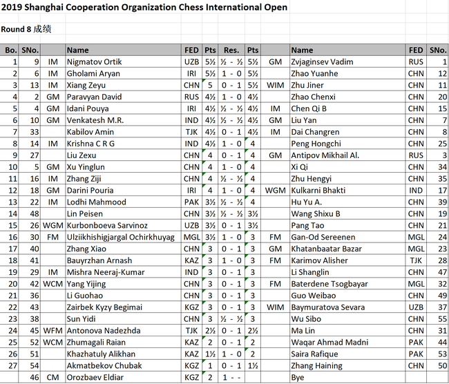 8轮比赛过后排名截止八轮比赛过后,朱锦尔与伊朗棋手阿瑞纳同积6.5分,奥提克、瓦蒂姆同积6分,戴常人、赵元赫与俄罗斯棋手David、印度棋手Krishna同积5.5分。