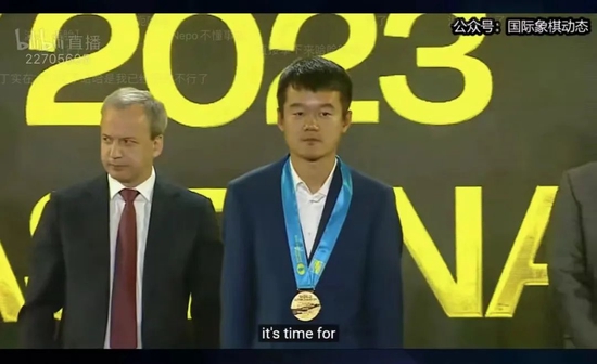 按照国际象棋的惯例,新冠军丁立人戴上了绿色花冠。然后,德沃尔科维奇为他颁发金牌奖杯。