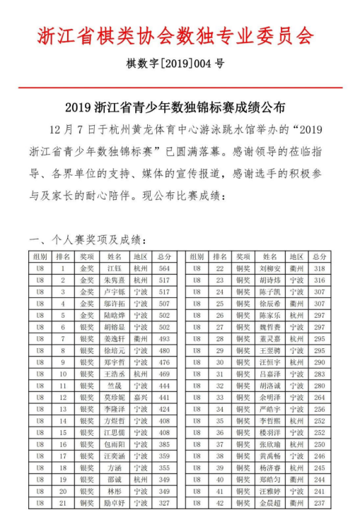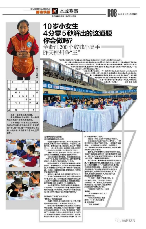 12月7日上午,由浙江省棋类协会、浙江省棋类协会数独专业委员会主办、杭州诚熹教育科技有限公司承办、并由浙江省体育局、浙江省智力运动管理中心指导及浙江省逻辑学会、浙江省逻辑学会儿童思维专业委员会多家单位支持的“2019浙江省青少年数独锦标赛”正式启幕。近400名U8——U18的小选手参与了这场最推理、最逻辑、最智慧的数独锦标赛。