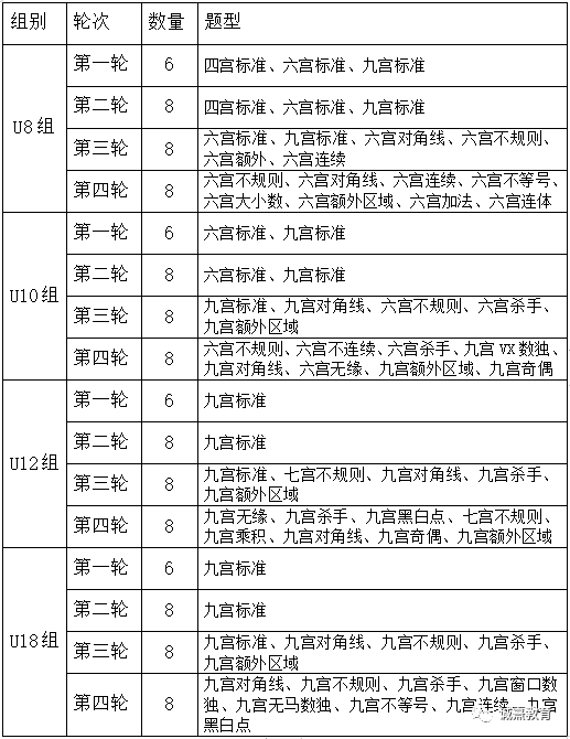 每队根据四名选手团体赛总分确定名次,如果团体分相同,按照四个人个人赛总分依次排名。选手完成比赛时间以选手举手时间计算,由现场裁判确定选手交卷次序。U8、U10根据地区组别自行组队,U12、U18根据地区混合组队,4人成队,以公众号上报名为准。最后决出U8组、U10组、U12U18混合组一等奖二等奖三等奖各一队,获取优胜奖杯、奖状及奖品。