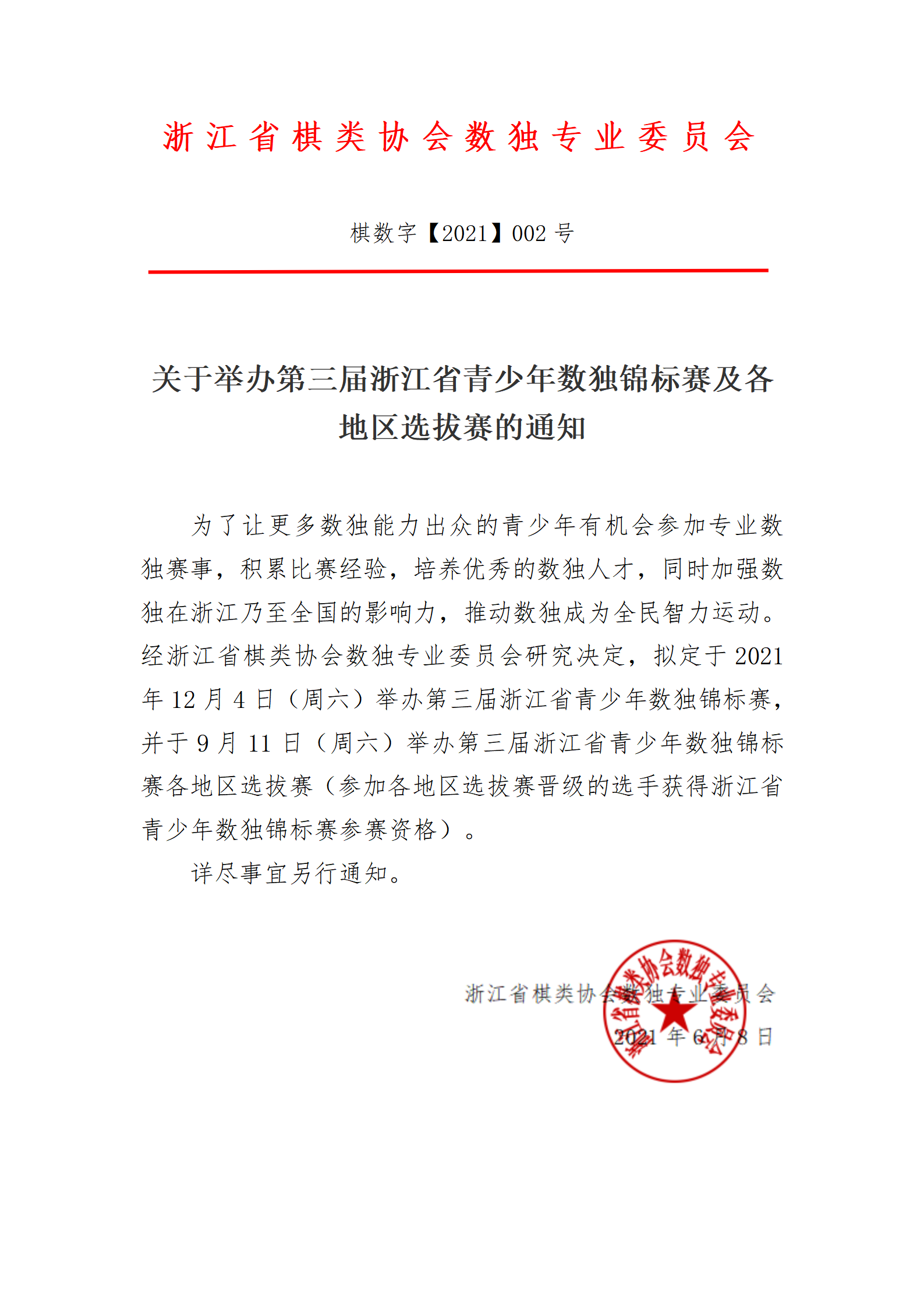 在各地级市团市委、教育局、体育局、少工委等多家单位的支持下,杭州、衢州、宁波、温州、嘉兴、金华、绍兴、台州等地于2021年9月11日同步举办第三届浙江省青少年数独锦标赛各地区选拔赛。