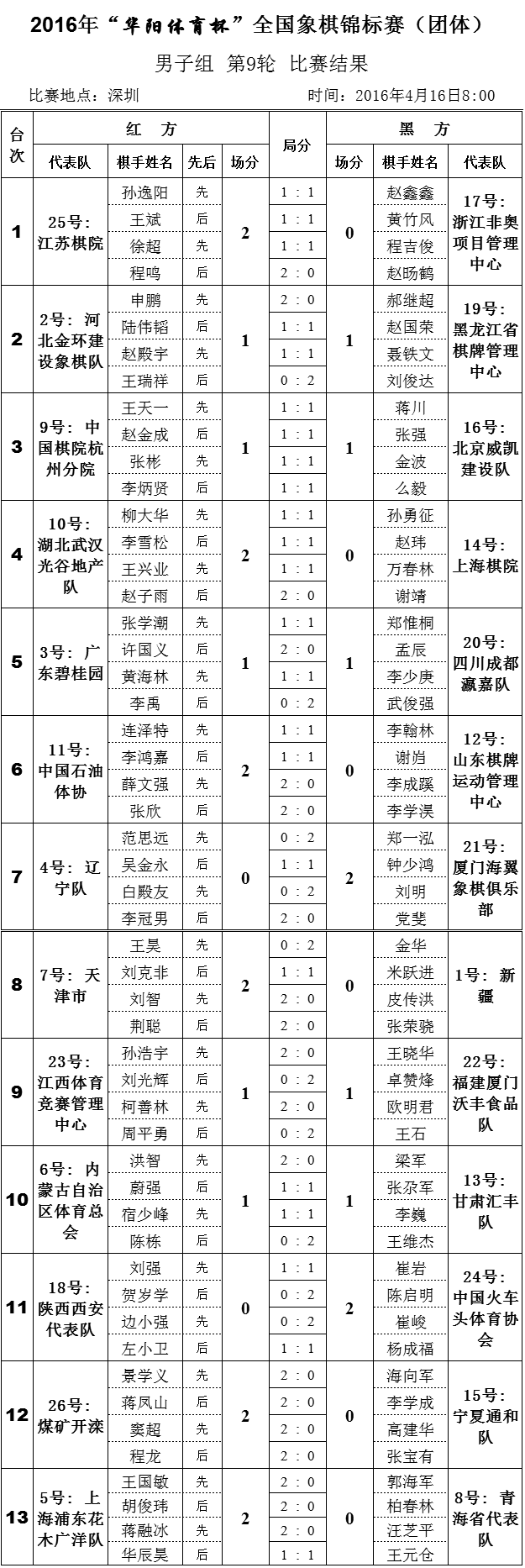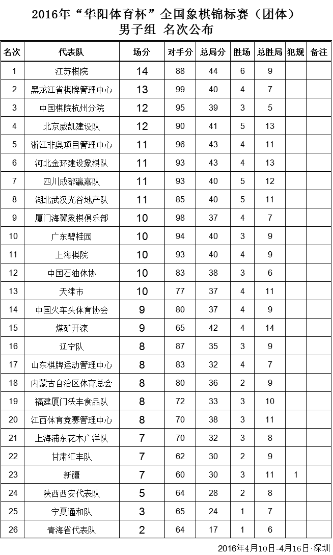 中国智力运动网讯 北京时间4月16日,2016年“华阳体育杯”全国象棋锦标赛(团体)在深圳坪山金茂园大酒店落幕。最终男子团体争冠焦点大战,黑龙江队在刘俊达先下一城的情况下,郝继超被申鹏所败,黑龙江憾平河北。江苏队再次凭着程鸣的绝杀一击,以5比3力克了浙江,江苏九战6胜2平1负积14分豪夺桂冠,这是该队继1996年之后,整好时隔20年,历史上的第二座全国团体金杯,程鸣在最后的四轮里连续四场绝杀立下惊世奇功。黑龙江13分屈居亚军,杭州、北京分获季军、殿军。