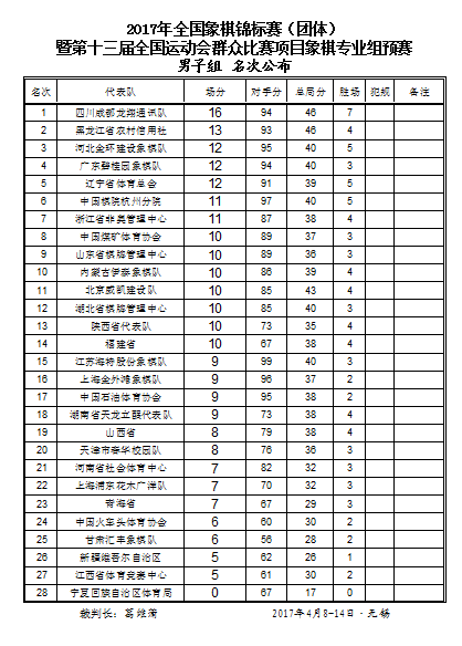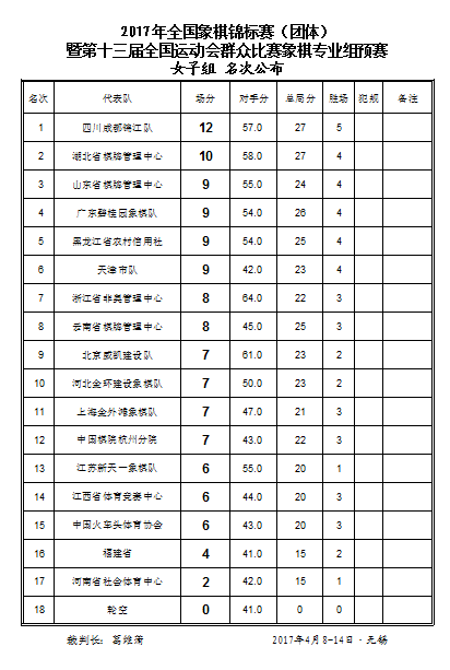 中国棋牌网讯 4月14日,“玉祁酒业杯”2017全国象棋团体赛暨全运会专业组预选赛尘埃落定,四川男女两队霸气冲天,双双夺冠,同创历史首冠,光耀全国。