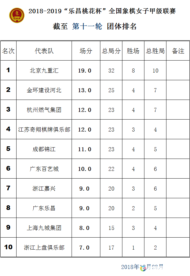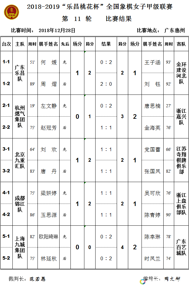女子象甲第11轮赛果:广东2:2河北 杭州1:3浙江